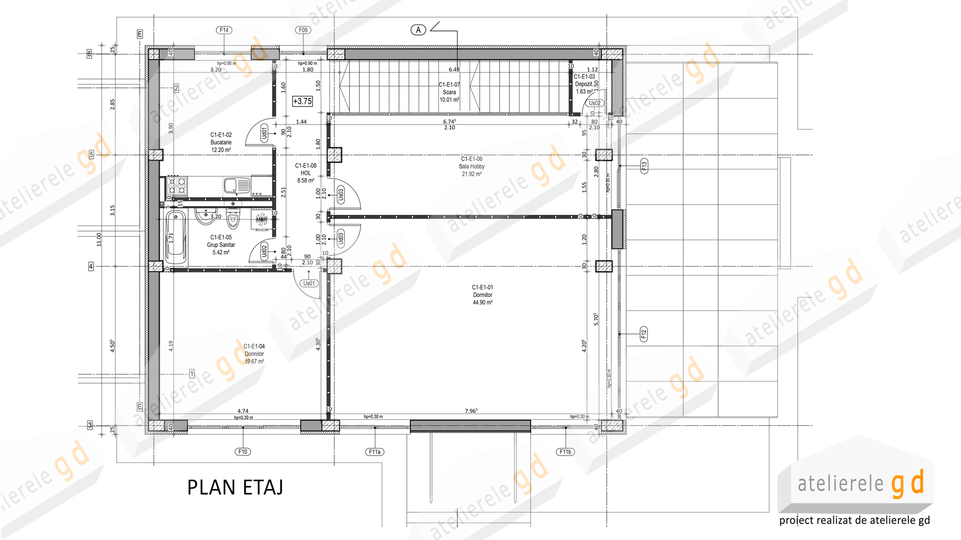 Proiectul cuprinde 2 corpuri de constructie, corpul de locuință cu regim de înalțime P+1E si